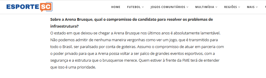 Essa não foi a primeira vez que Vechi garantiu uma solução para o espaço e não cumpriu. A recuperação do telhado da Arena era uma promessa de campanha desde 2023 do então prefeito interino, e foi assumida oficialmente em entrevista ao EsporteSC pelo próprio prefeito em 1º de setembro daquele ano, há dois dias das eleições suplementares. “Quem estiver à frente da FME terá de entender que isso é uma prioridade”, disse, na ocasião. No entanto, após a primeira eleição, conforme o mandato do prefeito avançou, nada mudou.