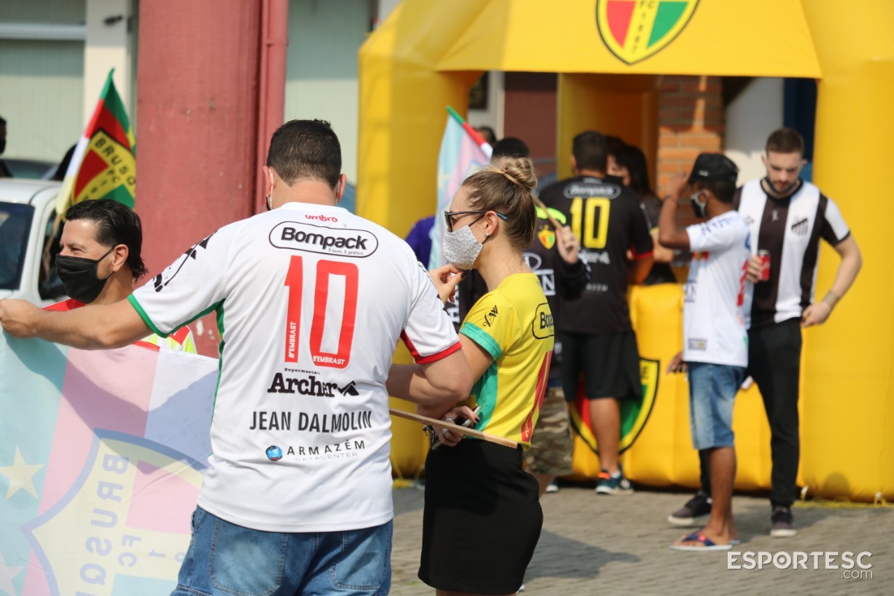 Desde cedo, centenas de carro passaram em frente ao estádio buzinando, com faixas e adereços do clube, que entregou no estádio 500 bandeiras aos torcedores. Com batuques e cantos, a torcida organizada do Brusque também marcou presença com os tradicionais gritos de incentivo.