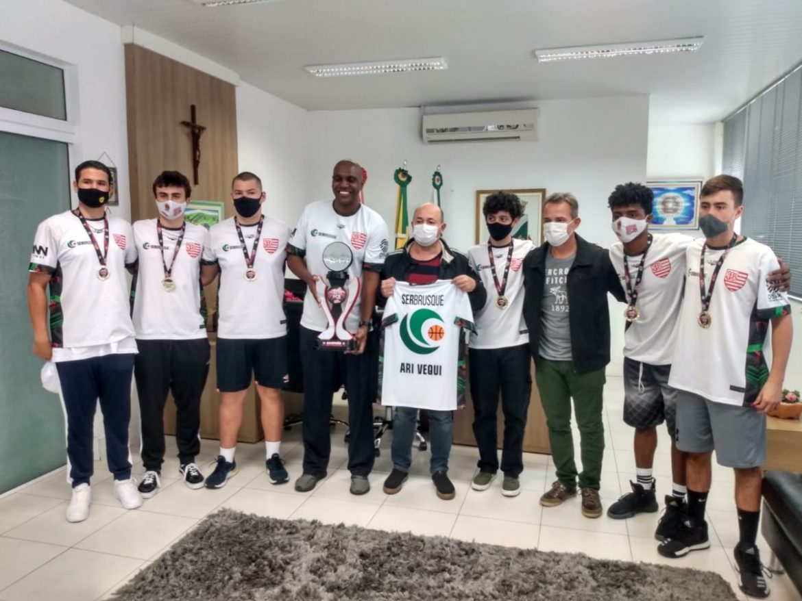 A equipe brusquense de basquete masculino sub-16, SER Brusque, esteve no gabinete do prefeito Ari Vequi para uma visita na última segunda-feira (16) no gabinete do prefeito Ari Vequi para uma visita. Na ocasião, eles aproveitaram para apresentar o troféu de campeão da categoria e presentear o prefeito com uma camisa oficial da equipe.