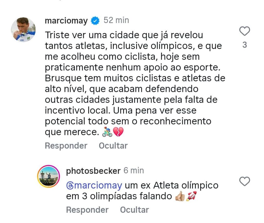 “Triste ver uma cidade que já revelou tantos atletas, inclusive olímpicos, e que me acolheu como ciclista, hoje sem praticamente nenhum apoio ao esporte. Brusque tem muitos ciclistas e atletas de alto nível, que acabam defendendo outras cidades justamente pela falta de incentivo local. Uma pena ver esse potencial todo sem o reconhecimento que merece”, escreveu Márcio May.